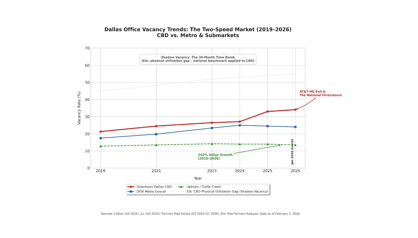 The impact metrics are sobering. A 2025 Boston Consulting Group study commissioned by Downtown Dallas Inc. estimated that AT&T’s exit would trigger a 30% decline in downtown property values, representing a $2.7 billion drop and a $62 million annual loss in property tax revenue for the City of Dallas. AT&T’s Discovery District—an entertainment campus opened in 2021 with a two-story food hall, lawn seating, and a multi-story outdoor screen—faces an uncertain future; the company has declined to comment on its plans for the property or whether it will retain any downtown presence. AT&T owns three buildings downtown and leases the 37-story Whitacre Tower through 2031. As a practical matter, AT&T will remain a physical presence in the CBD for several more years—but the psychological signal of a Fortune 50 headquarters relocation is immediate, and the company’s silence on its downstream real estate strategy suggests a full disposition is at least plausible. If AT&T completely vacated, CoStar estimates the CBD vacancy rate would rise to 33.7%—surpassing Seattle for the highest central business district vacancy rate in the country.